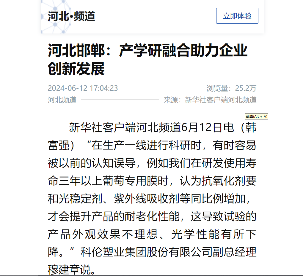 科倫塑業(yè)集團(tuán)股份有限公司于2024612日就公司成長歷程、產(chǎn)學(xué)研融合助力企業(yè)創(chuàng)新發(fā)展方面,公司副總經(jīng)理穆建章接受新華社河北分社采訪,報(bào)道詳情如下